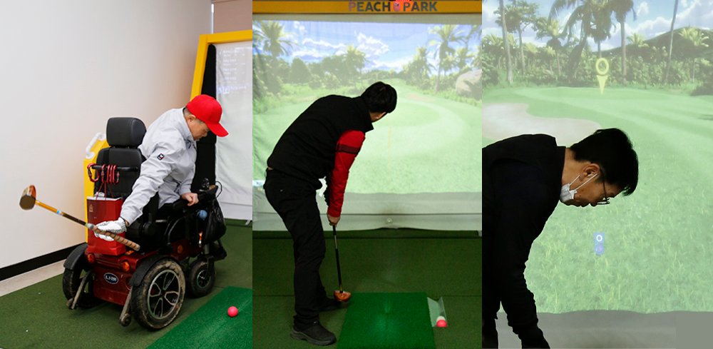 11시가 지나자 휠체어를 탄 이덕규 선생이 들어섰다. 환한 웃음이지만 상당한 구력(?)이 느껴졌다. 스윙을 청하자 휠체어를 빙 돌려서 뒤에 꽂은 클럽을 빼달라고 했다. 클럽 길이가 다른 사용자에 비해 짧아 보였다. 샷을 위해 공 앞으로 휠체어를 잠깐 이동했고 오른손으로 멋진 스윙을 했다. “나이스샷”