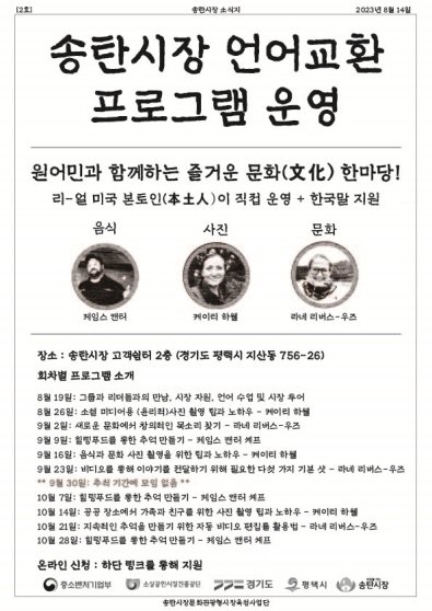 시 관계자는 “프로그램 참가 신청은 포털에서 ‘송탄시장문화익스체인지마켓’ 검색 후 송탄시장문화관광형시장 육성사업단에서 운영하는 블로그를 통해 신청할 수 있으며, 한국 문화에 관심있는 외국인, 외국인 친구를 만들고 싶은 한국인의 많은 신청을 바란다”고 말했다.
