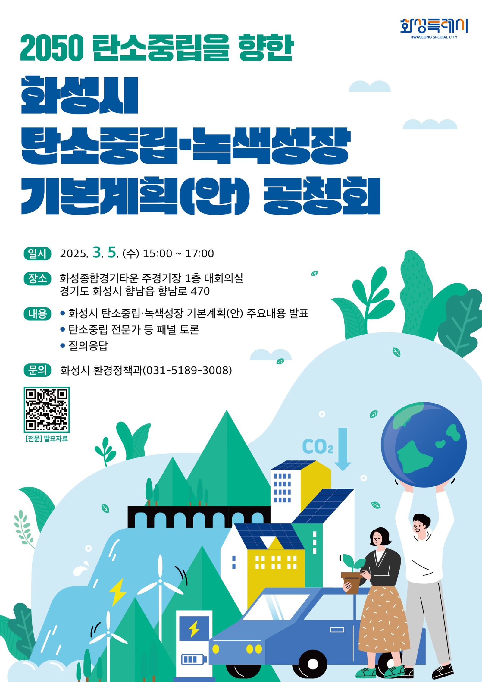 화성특례시가 다음 달 5일 오후 3시 화성종합경기타운 주경기장 1층 대회의실에서 ‘화성특례시 탄소중립·녹색성장 기본계획 수립(안)’ 공청회를 개최한다.