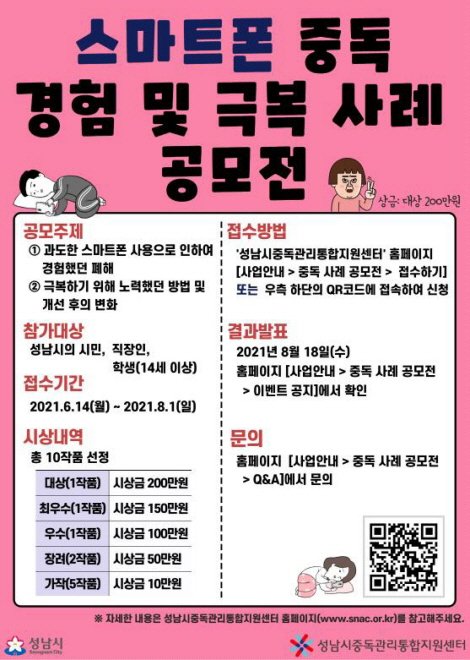 갈수록 스마트폰 사용이 증가하는 이때 성남시(시장 은수미)는 오는 8월 1일까지 ‘스마트폰 중독 경험 및 극복 사례’를 공모한다.