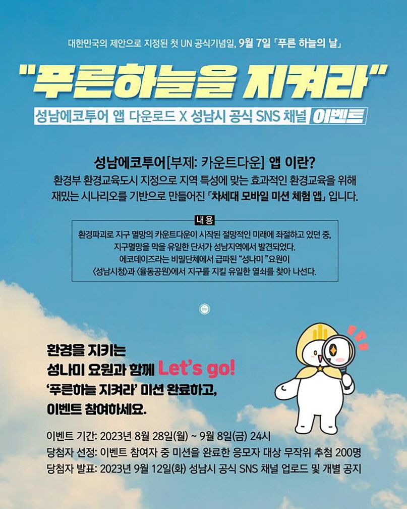 이 앱은 대한민국의 제안으로 2019년도에 유엔(UN)이 공식 기념일로 지정한 푸른하늘의 날(9월 7일)을 기념해 성남시가 최근 6개월간 1억2000만원을 들여 자체 개발한 교육용 플랫폼이다.