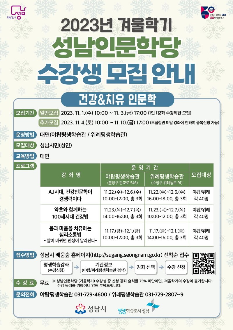 성남시는 오는 11월 1일부터 10일까지 ‘건강과 치유’를 주제로 한 인문학 프로그램(총 9회) 수강생 240명을 모집한다.