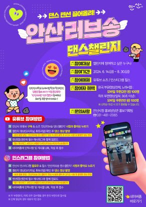 참여 방법은 안산시 공식 소셜미디어를 통해 공개된 ‘안산 러브송’ 댄스 영상을 보고 음원과 댄스를 숙지한 후, 본인의 인스타그램 또는 유튜브 계정에 직접 촬영한 댄스 영상을 게시하고