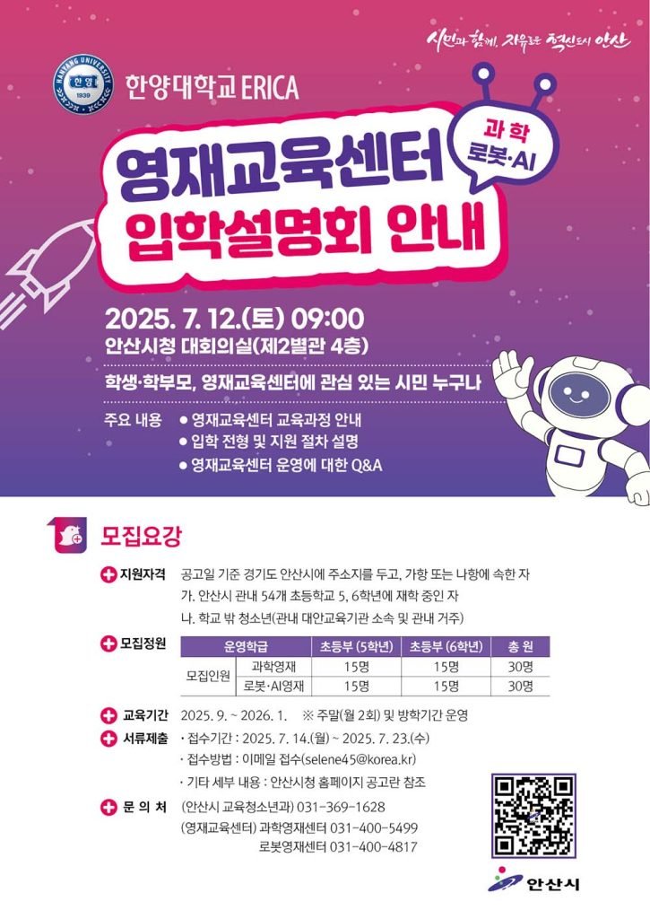 안산시는 오는 12일 ‘한양대학교 ERICA 영재교육센터’ 입학설명회를 개최한다고 9일 밝혔다.