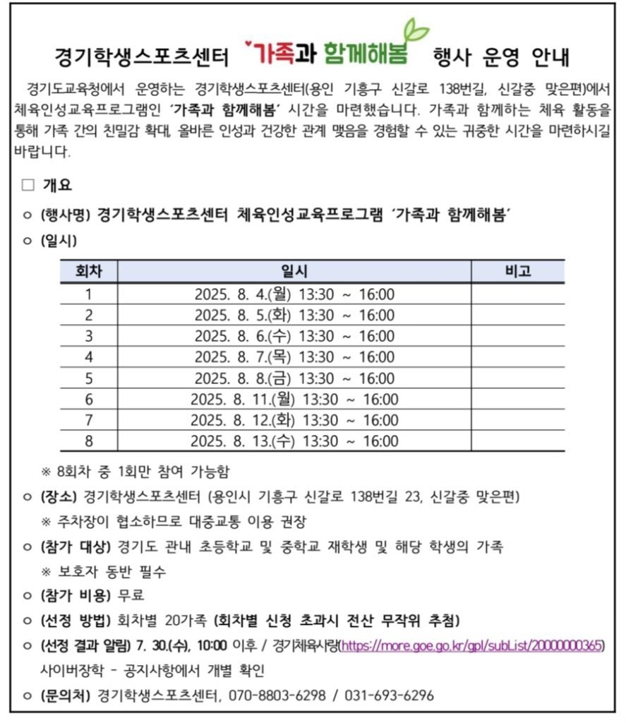 경기도교육청 산하 경기학생스포츠센터가 가족 참여형 체육행사인 ‘가족과 함께해봄’을 운영한다. 이번 행사는 가족 간 소통과 유대를 강화하고, 건강한 여가문화 조성을 위해 마련됐다.