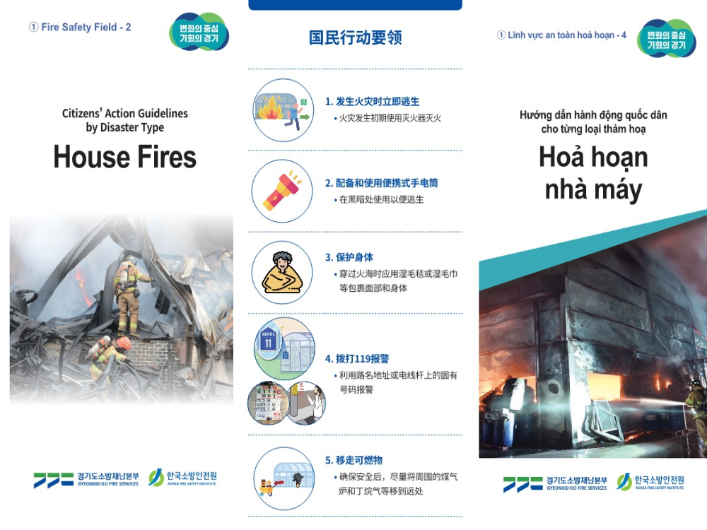 경기소방은 지난 5월 전국 최초로 각종 재난유형을 4대 분야 54종으로 구분한 재난유형별 국민 행동 요령을 제작했는데, 이 중 주택 화재 등 3종을 외국어로 번역했다.