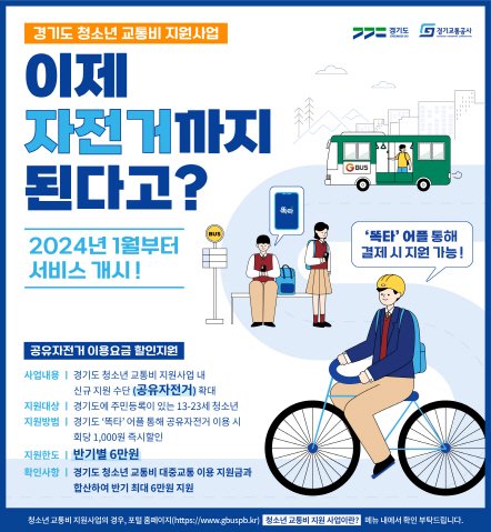 한편, 경기도는 2020년부터 ‘청소년 교통비 지원사업’을 통해 도내 청소년이 대중교통 이용 시 연간 최대 12만 원을 지원하고 있다.