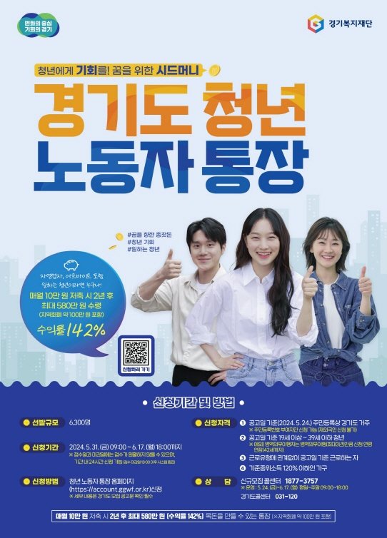자세한 사항은 청년 노동자 통장 신규 모집 콜센터(1877-3757), 경기도 콜센터(031-120)에 문의하면 된다.