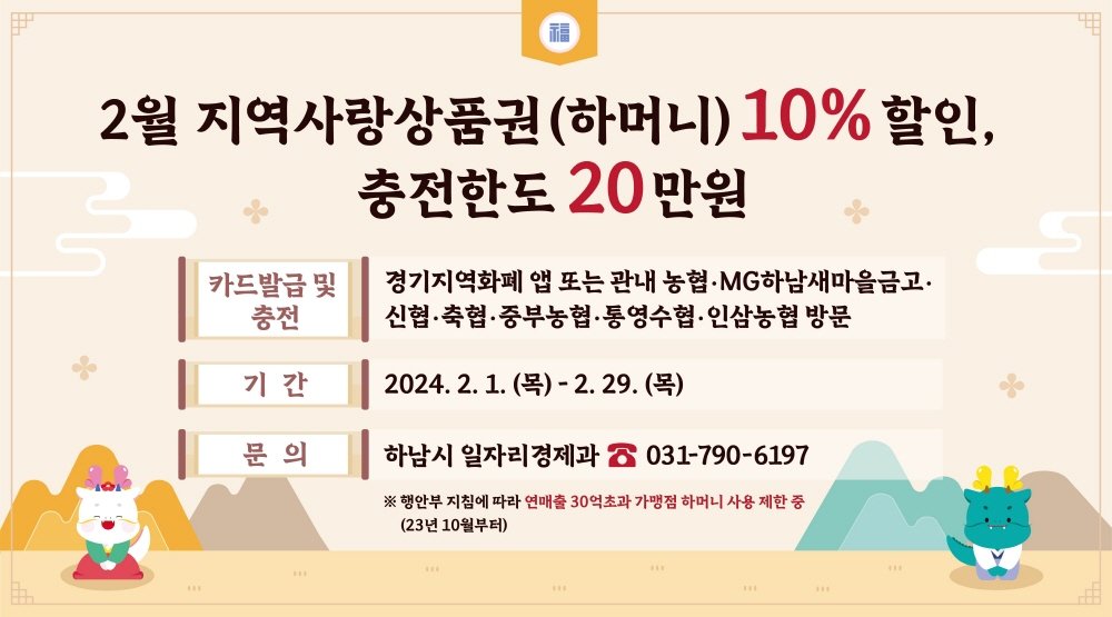 하남시(시장 이현재)가설 명절을 맞아 2월 지역화폐 ‘하머니’충전 한도 20만원, 10%특별할인을 실시한다.