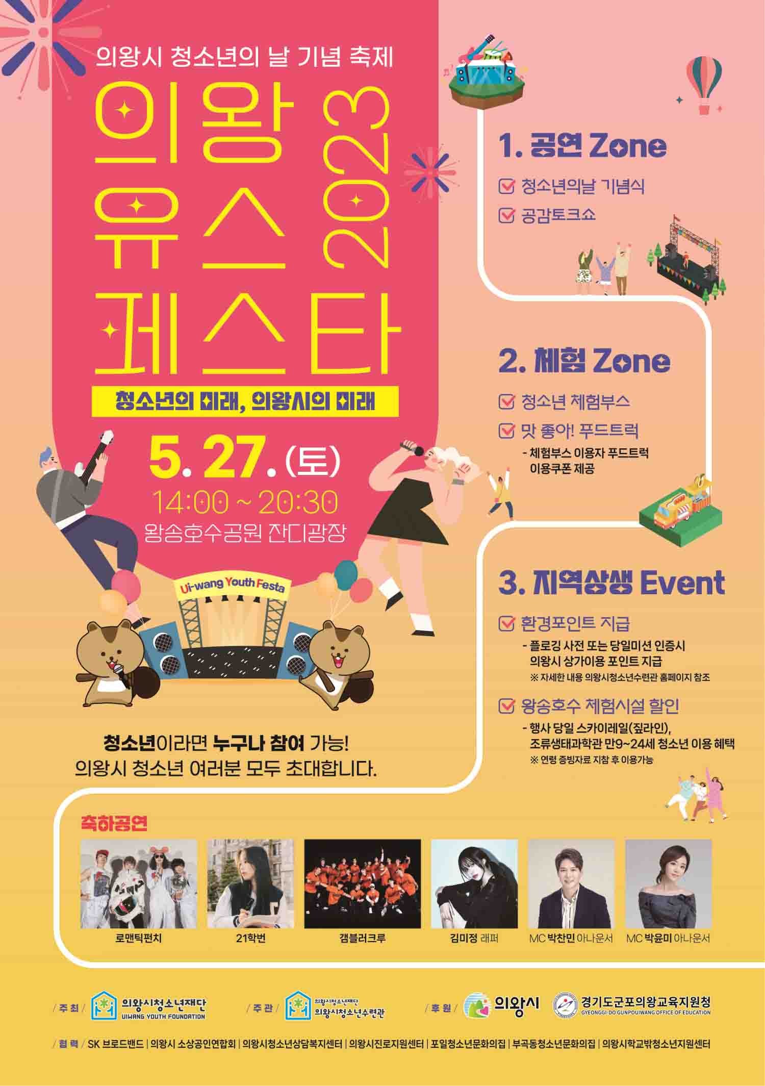 특히, 김성제 의왕시장과 청소년이 함께하는 공감토크쇼는 의왕시에 바라는 청소년의 의견을 듣고 청소년을 위한 시 정책에 대해 이야기를 나누는 시간으로, 박찬민, 박윤미 아나운서의 사회와 로맨틱펀치, 21학번, 갬블러크루, 김미정 등의 축하공연이 함께 진행된다.