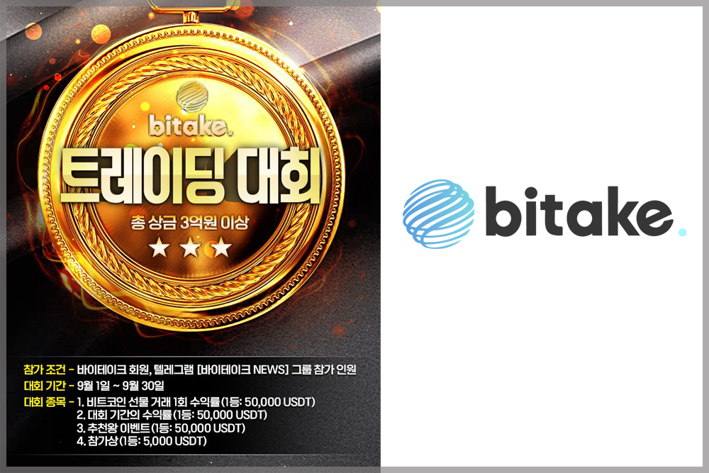 9월 한 달 동안 바이테이크가 트레이딩(거래) 대회를 연다. 회원으로 등록해야 하며 대회 상은 총 4개다. 비트코인 선물거래 1회 수익률 최대, 대회기간 전체 수익률, 추천왕 이벤트, 참가상 등으로 고객을 만나며 대회는 실시간 '라이브 뷰'로 중계된다.