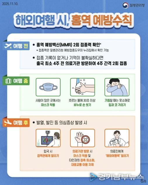 또한, 여행 중에는 손 씻기와 마스크 착용 등 개인위생을 철저히 하고, 여행 후 3주 이내 발열, 발진 등 홍역 의심 증상이 나타나면 반드시 마스크 착용 등 개인위생을 지키고 가까운 의료기관을 방문해야 하며, 진료 시에는 최근 해외여행 이력을 반드시 알려야 한다.