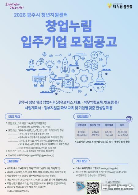 [경기남부뉴스 김혜숙 기자] 광주시는 지역 내 유망한 청년 창업가를 발굴하고 안정적인 창업 환경을 조성하기 위해 ‘2026년도 창업누림 신규 입주기업’을 공개 모집한다고 19일 밝혔다.