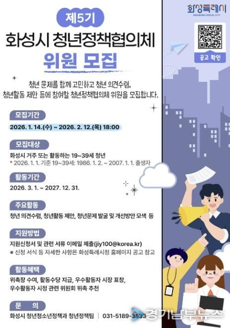 [경기남부뉴스 홍복순 기자] 화성특례시는 다음 달 12일까지 ‘제5기 화성시 청년정책협의체 위원’을 모집한다고 19일 밝혔다.