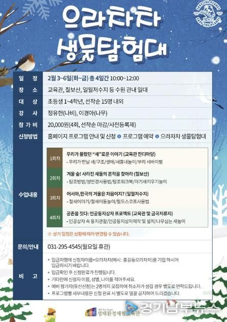 [경기남부뉴스 김정옥 기자] 칠보생태환경체험교육관이 겨울방학 프로그램 ‘으라차차 생물탐험대(겨울 탐조프로젝트)’에 참여할 초등학교 1~4학년 어린이 15명을 선착순으로 모집한다.