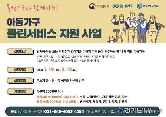 [경기남부뉴스 김혜숙 기자] 의왕시가 복권기금과 함께하는 경기도 ‘아동가구 클린서비스 지원사업’의 신청을 1월 19일부터 3월 13일까지 받는다.