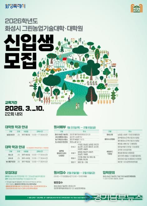 [경기남부뉴스 홍복순 기자] 화성특례시가 화성 농업을 이끌어갈 유능한 인재를 발굴해 집중 교육하기 위한 ‘2026년도 그린농업기술대학(원)’ 신입생을 모집한다고 22일 밝혔다.
