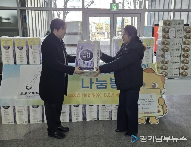 [경기남부뉴스 홍복순 기자] DSY바이크매니아가 지난 21일 동탄3동행정복지센터에 지역 내 어려운 이웃을 돕기 위해 롤휴지 100개와 전병 35박스를 기부했다.
