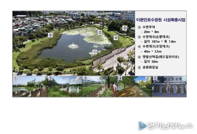 이번 사업은 이문안호수공원의 수변 공간을 중심으로 수변무대와 수변나무 바닥(데크), 맨발 산책길, 공중화장실 등 주민 설문조사를 통해 이용 수요가 높은 시설을 조성하고, 건강·여가·문화 기능을 동시에 강화하는 데 목적을 두고 있다.