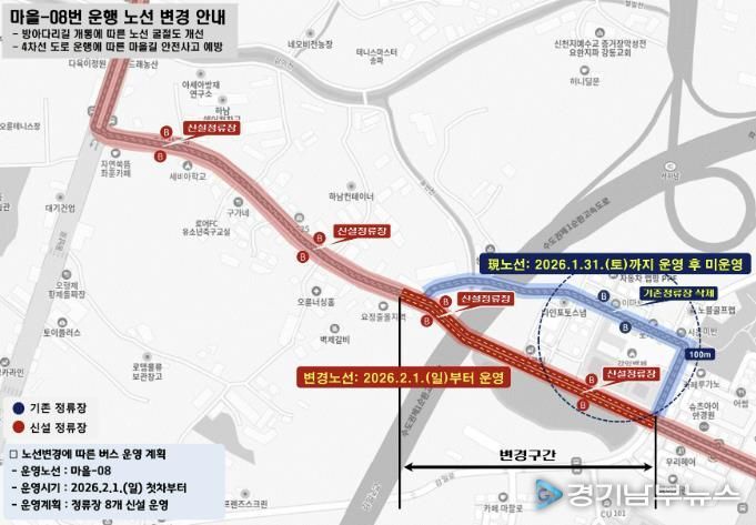 하남시는 방아다리길 전구간 개통에 따라 기존의 마을 소로를 경유하던 마을-08번 버스의 노선을 2026년 2월 1일(일) 첫차부터 새로 개통된 왕복 4차선 방아다리길로 우회하여 운행한다고 밝혔다.