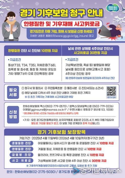 경기 기후보험은 폭염뿐 아니라 한파·폭설 등 겨울철 기후위험으로 발생한 한랭질환과 기후재해 사고에 대해 진단비와 위로금을 지원하는 제도로, 겨울철 일상 속 사고와 건강 피해까지 포괄적으로 보장한다.