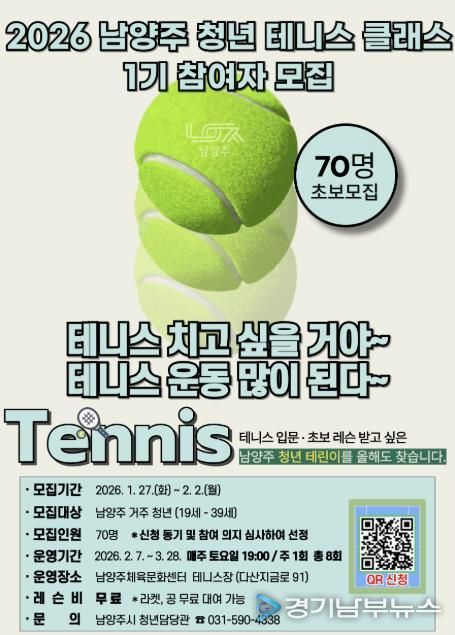 [경기남부뉴스 김혜숙 기자] 남양주시는 27일부터 내달 2일까지 ‘2026 남양주 청년 테니스 클래스 1기’ 참여자를 모집한다고 밝혔다.