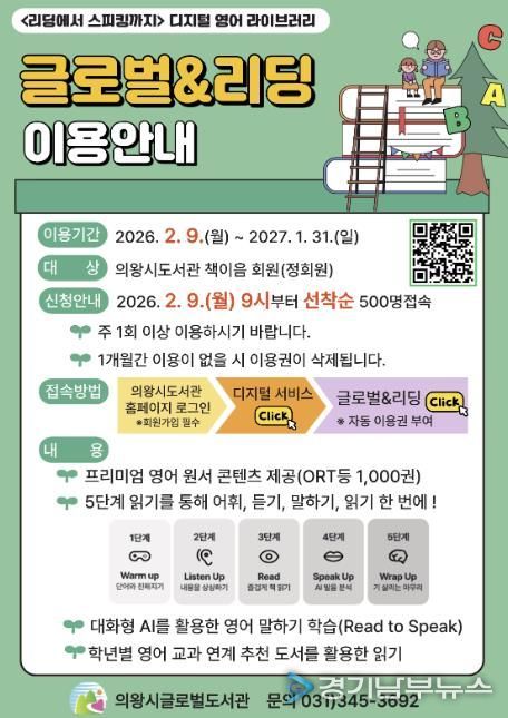 [경기남부뉴스 김혜숙 기자] 의왕시 글로벌도서관(보식골로 30-10)이 아동, 청소년의 자기 주도적 영어 독서 습관 형성과 실력 향상에 도움을 줄 수 있도록 디지털 영어 라이브러리를 활용한 온라인 영어 독서 콘텐츠 '글로벌 앤 리딩'을 제공한다.