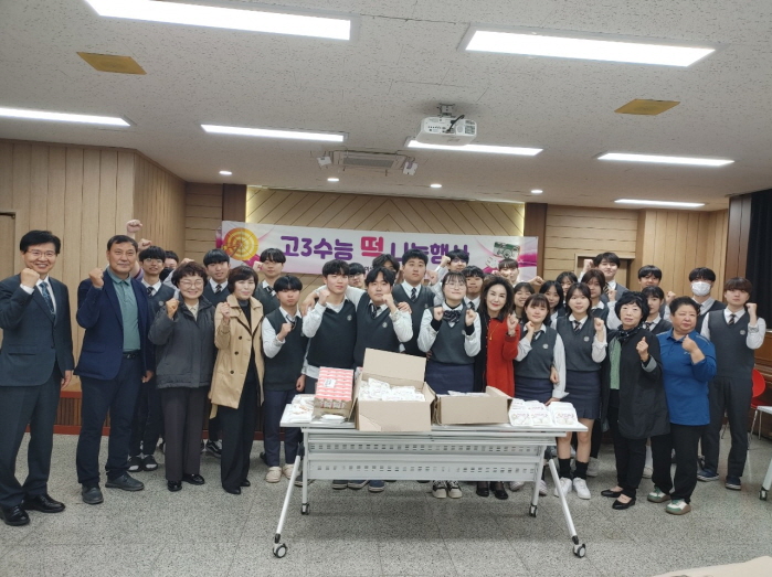 사)한국여성농업경영인 여주시연합회(회장 최형주)는 11월 6일(월) 대신고등학교에서 올해 수학능력시험을 치르는 고3 수험생들 격려를 위한 수능떡 나눔의 귀한 시간을 가졌다.