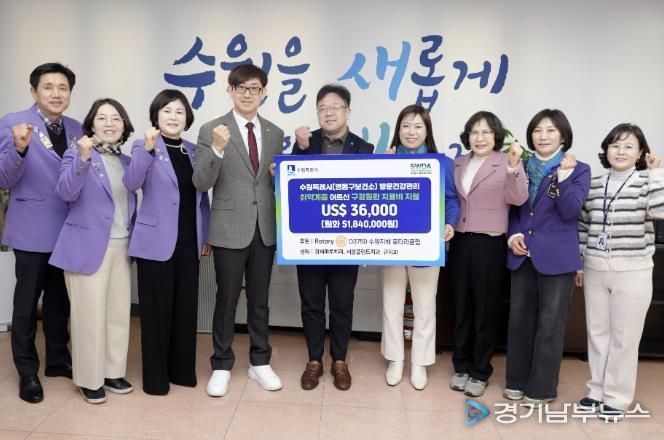 [경기남부뉴스 김정옥 기자] 국제로타리3750지구 수원지해로타리클럽이 “취약계층 어르신 구강 질환 치료에 사용해 달라”며 수원 영통구보건소에 후원금 3만 6000달러(5184만 원)를 전달했다.