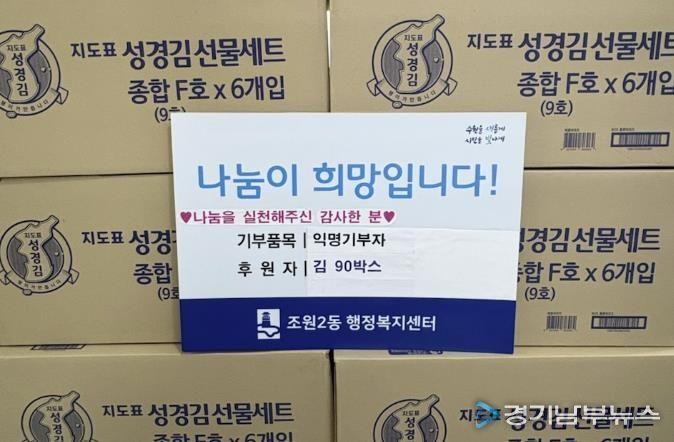 [경기남부뉴스 김정옥 기자] 수원시 장안구 조원2동은 지난 3일, 설 명절을 맞아 익명의 기부자가 김 81박스를 기탁해 지역사회에 따뜻한 온정을 전했다고 밝혔다.