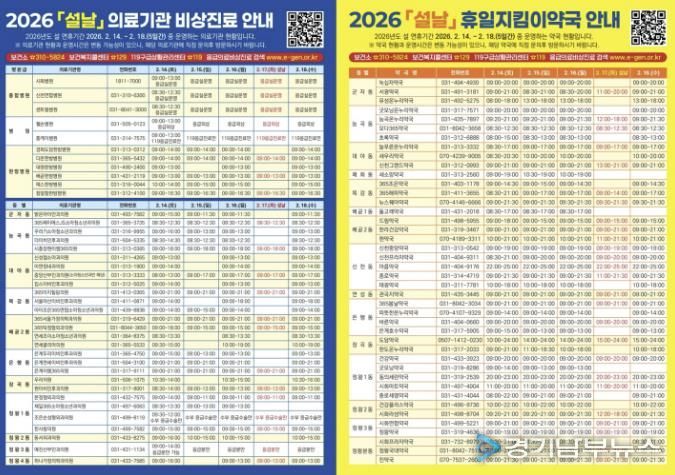 설 연휴 기간 의료기관 비상진료 및 휴일지킴이 약국 운영 현황은 시흥시청 누리집 새소식 게시판과 시흥시 블로그에 게시된 홍보물의 정보무늬(큐알코드)를 통해 실시간으로 확인할 수 있다.