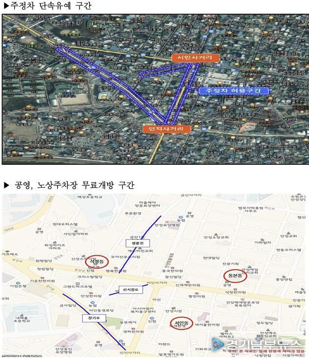 주정차 단속 유예 구간은 안성맞춤시장(서인사거리~인지사거리 구간 양측 300미터)과 중앙시장(서인사거리~안성농협 양측 100미터, 석정삼거리~인지사거리 양측 500미터) 주변 도로이며, 서인동·동본동·석정동의 건축식 공영주차장과 전통시장 주변 노상주차장이 무료 개방된다.