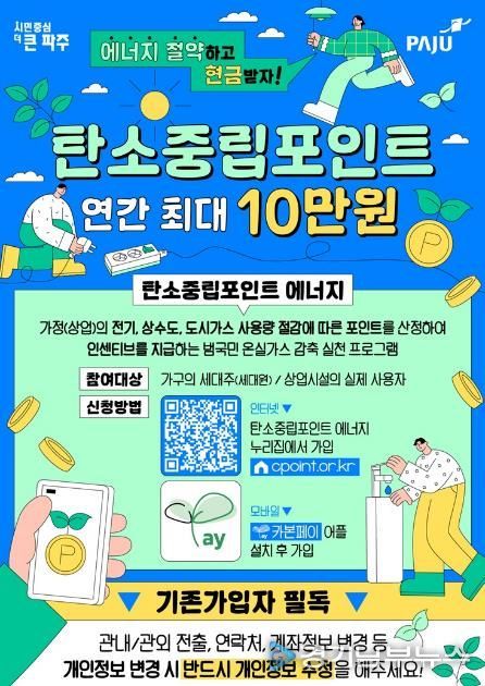 [경기남부뉴스 김혜숙 기자] 파주시는 생활 속 탄소중립 실천을 통한 온실가스 감축을 위해 탄소중립포인트제 에너지 분야 신규 참여자를 연중 상시 모집한다.