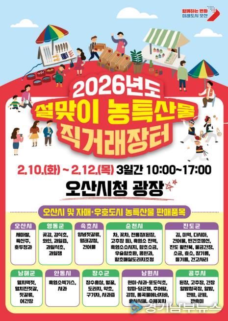 [경기남부뉴스 김혜숙 기자] 오산시는 설 명절을 맞아 오는 2월 10일부터 12일까지 3일간, 오전 10시부터 오후 5시까지 오산시청 광장에서 자매·우호도시와 함께하는 ‘설맞이 농특산물 직거래장터’를 개최한다고 밝혔다.
