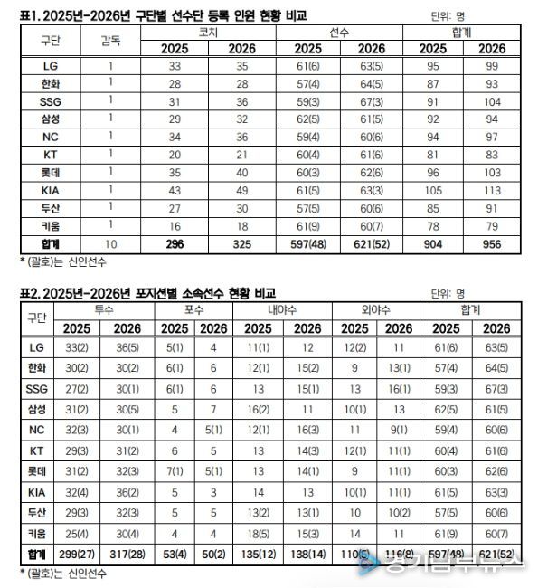 [경기남부뉴스 김혜숙 기자] KBO는 2월 10일(화) 2026년 KBO 리그 소속 선수 명단을 공시했다. 10개 구단은 총 621명의 선수를 등록해, 597명이 등록했던 2025년보다 24명이 늘어났다.