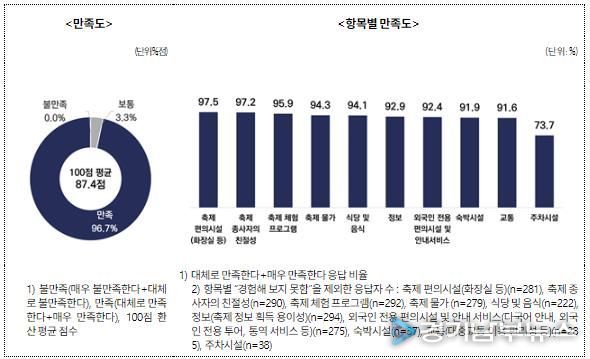 실제 외국인 축제 만족도는 평균 87.4점으로 나타났으며, 응답자의 98%는 ‘타인에게 추천할 의향이 있다’고 답했다. 2026년 재방문 의향 역시 80.7%로 조사돼, 일회성 방문이 아닌 반복 방문 가능성도 확인됐다.