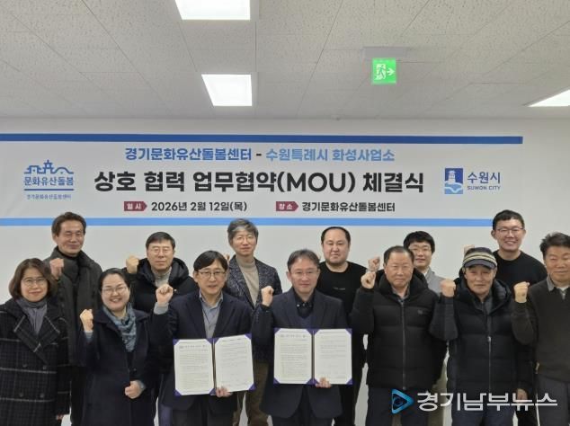 [경기남부뉴스 김정옥 기자] 수원시 화성사업소와 경기문화유산돌봄센터가 12일 경기문화유산돌봄센터에서 ‘수원화성 마을장인’ 육성과 수원화성 보수 네트워크 구축을 위한 업무협약을 연장 체결했다.