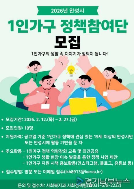 [경기남부뉴스 김혜숙 기자] 안성시는 1인가구 시민의 생활 속 이야기와 의견을 정책에 담기 위해 '2026년 안성시 1인가구 정책참여단'을 오는 2월 27일까지 공개 모집한다고 밝혔다.