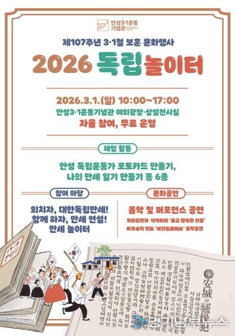 [경기남부뉴스 김혜숙 기자] 안성3·1운동기념관은 제107주년 3·1절을 맞아 오는 3월 1일, 3·1운동의 역사를 즐겁게 체험하며 그 숭고한 정신을 함께 나누는 보훈 문화행사 '2026 독립놀이터'를 개최한다고 밝혔다.