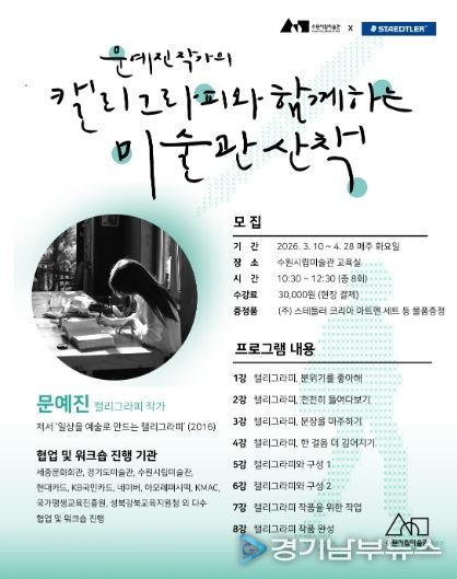 [경기남부뉴스 김정옥 기자] 수원시립미술관은 독일 문구 기업 ㈜스테들러 코리아와 공동으로 '캘리그라피와 함께하는 미술관 산책'을 3월 10일부터 4월 28일까지 운영하며 참가자를 모집한다.