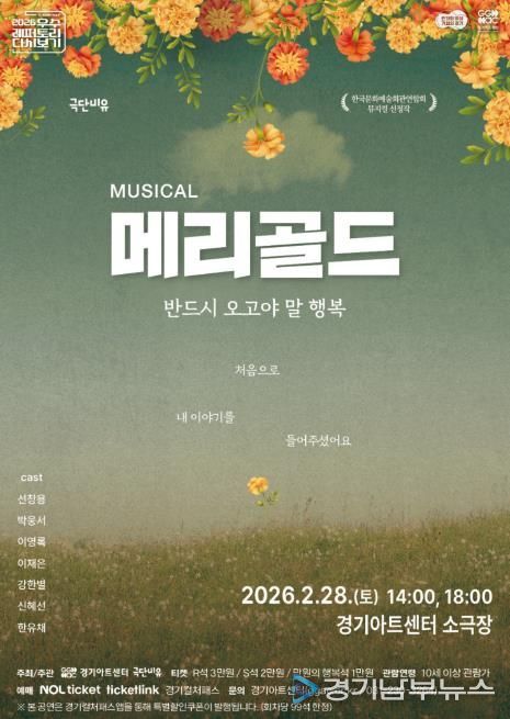 [경기남부뉴스 김혜숙 기자] 경기도와 경기아트센터는 오는 28일 오후 2시와 6시 경기아트센터 소극장에서 뮤지컬 ‘메리골드’ 공연을 선보인다.