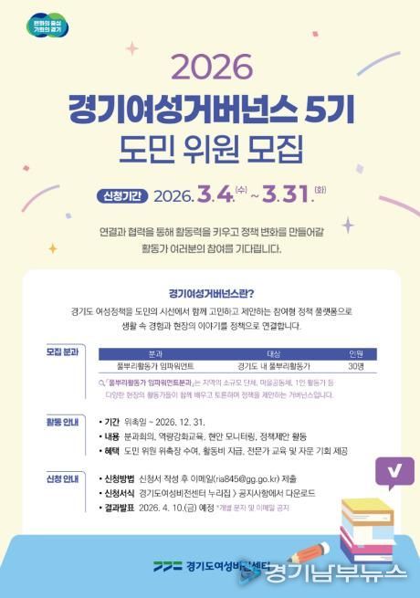 [경기남부뉴스 김혜숙 기자] 경기도여성비전센터가 2026년 ‘경기여성거버넌스’에서 활동할 도민위원을 오는 3월 31일까지 모집한다.