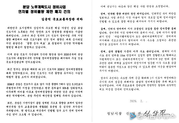 [경기남부뉴스 김혜숙 기자] 성남시는 김윤덕 국토교통부 장관에게 전달한 서한문을 25일 공개하며, 성남시의 핵심 현안인 ‘광역교통망 확충’과 ‘분당 신도시 재건축 정상화’를 위한 정부의 전향적인 결단을 촉구했다.
