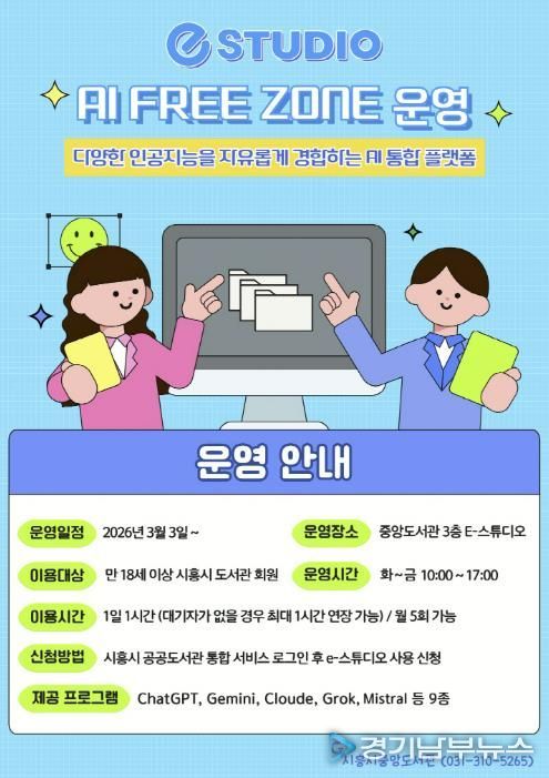 [경기남부뉴스 김혜숙 기자] 시흥시중앙도서관은 시민들의 인공지능(AI) 활용 역량 강화를 위해 시 정보통신과와 협업해 도서관 3층 e-스튜디오에 ‘인공지능(AI) 프리 존(Free Zone)’을 구축하고, 오는 3월 3일부터 본격 운영에 들어간다.