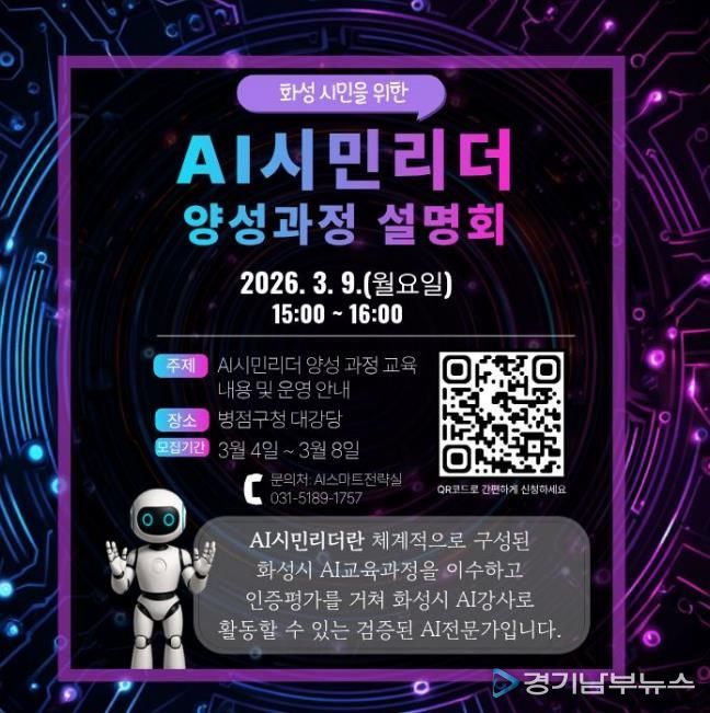 [경기남부뉴스 김정옥 기자] 화성특례시는 시민이 학습하고 교육하는 인공지능(AI) 학습 체계 구축을 위해 ‘2026년 AI시민리더 양성 교육’ 설명회를 3월 9일 오후 3시에 병점구청 대강당에서 개최한다.