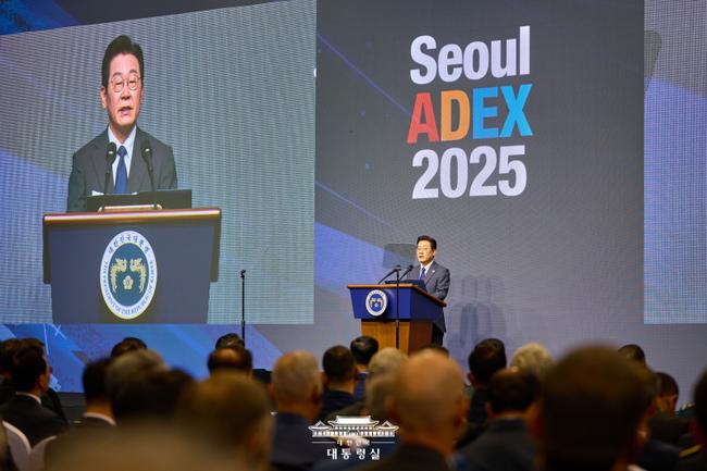 이재명 대통령은 20일 오전 경기 고양시 킨텍스에서 열린 ‘2025 서울 국제 항공우주 및 방위산업 전시회(ADEX 2025)’ 개막식과 ‘방위산업 발전 토론회’에 참석해 K-방산의 경쟁력 제고와 제도 혁신 방안을 논의했다.