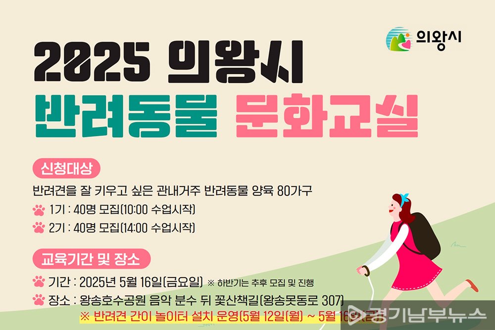 상반기 문화교실은 의왕시에 거주하는 반려인 80가구를 대상으로 추진되며, 오는 16일 하루 동안 총 2회로 나눠 운영된다. 1기는 오전 10시부터 1시까지, 2기는 오후 2시부터 5시까지 진행되며, 왕송호수공원 음악분수 뒤 꽃 산책길(왕송못동로 307)에서 열린다.