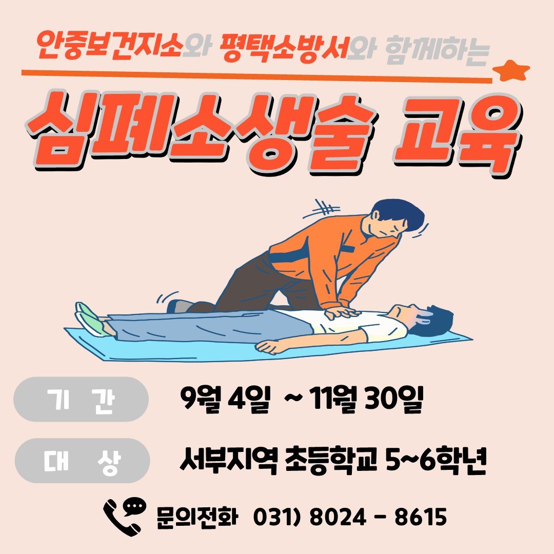 평택시 안중보건지소는 평택소방서와 협력하여 어린이 재난안전교육으로 ‘찾아가는 심폐소생술 교육’을 오는 9월 4일부터 11월 30일까지 4개 초등학교에서 진행한다.
