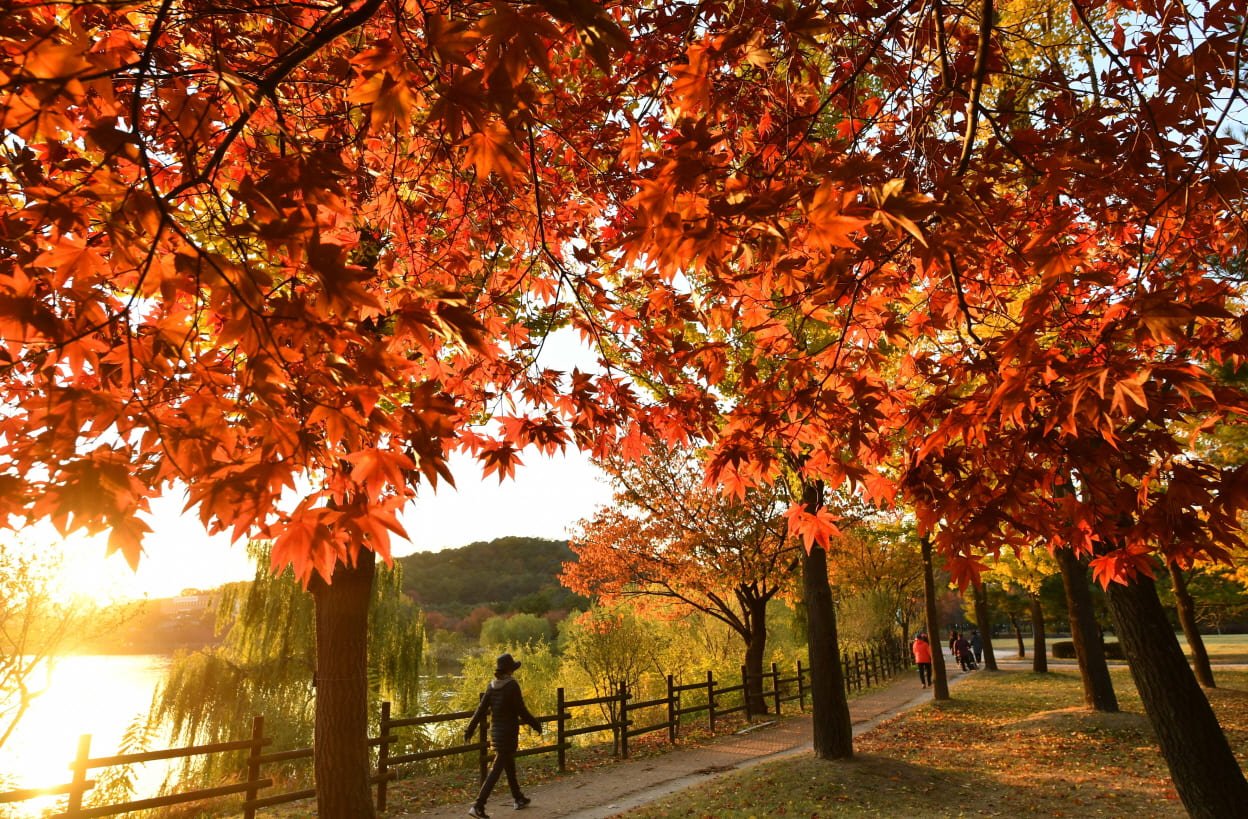 수원 팔색길 첫 번째 길인 모수길 코스 중 서호공원을 시민들이 지나가고 있다.