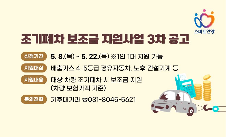 도심 속 미세먼지의 주범 중 하나는 바로 노후 경유차다. 10년 이상 된 노후차량은 최신차에 비해 유해물질을 배출하며, 대기오염과 시민 건강에 심각한 위협을 준다. 이에 안양시는 대기환경 개선과 시민 건강 보호를 위해 노후자동차 조기폐차 지원사업을 추가로 실시한다.